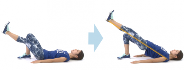 ヒップリフトよりお尻の筋肉に刺激が入りやすくなります。ポイントはお腹に力を入れて、かかとで床を押すように行うこと。お尻を床ギリギリから一番高いところまで大きな可動域で動かすことで、お尻の筋肉をまんべんなく使うことができます。