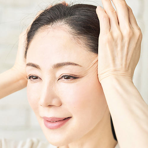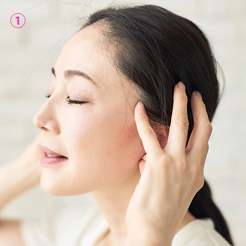 親指の付け根を耳上の頭皮に当て、頭皮を上に押し上げるようにしながらマッサージ。少しずつ位置をずらして頭頂部まで行いましょう。
