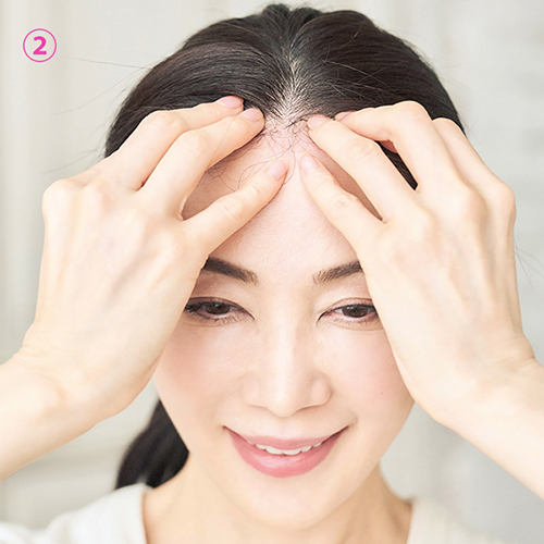 生え際に指を置いて指の腹でぐるぐる。リフトアップさせるように後方に向かって頭皮を動かして。前頭部をマッサージ。