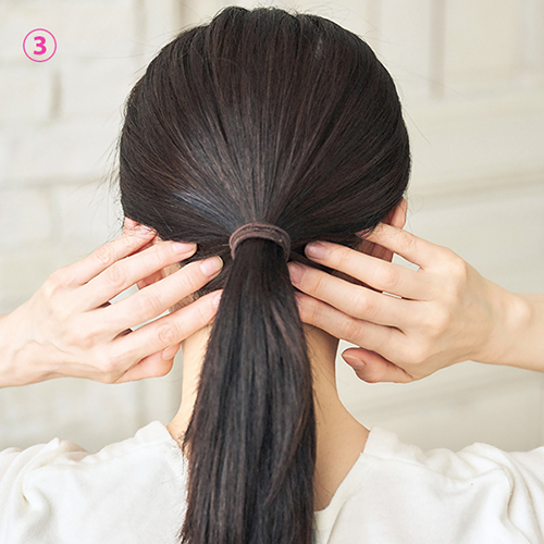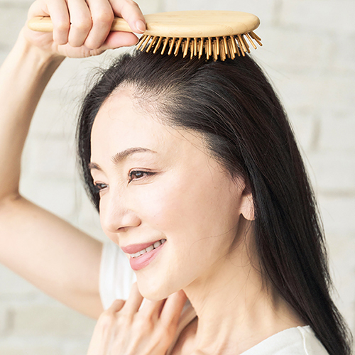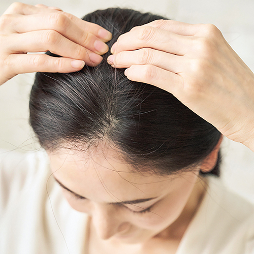頭のてっぺんを指圧で刺激して。中3本の指の腹を使って、「百会」のツボを心地よい強さで押しながら頭皮の血行を促進させましょう。