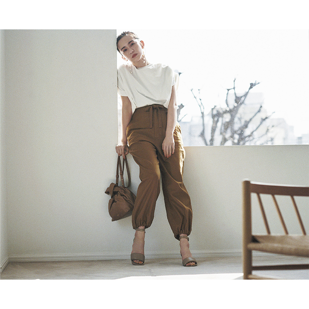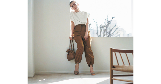 パンツ¥17,600(ブラックバイマウジー/バロックジャパンリミテッド)Tシャツ¥12,100(ウーア/カレンソロジー 青山)バッグ¥51,700(デメリエー/ガリャルダガランテ 表参道店)パンプス¥33,000(ピッピシック/ベイジュ)ピアス¥35,200(MAAYA)