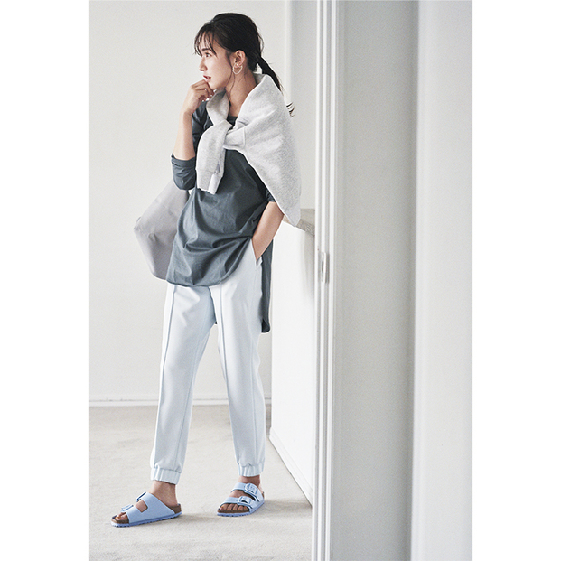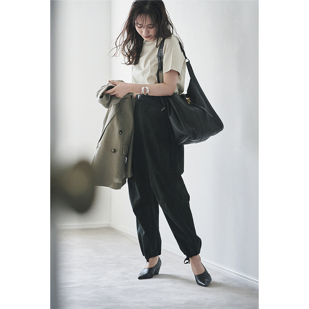パンツ¥41,800(ギャルリー・ヴィー/ギャルリー・ヴィー 丸の内店)Tシャツ¥4,950(ミラ オーウェン/ミラ オーウェン ルミネ新宿2店)ジャケット¥53,900(サクラ/インターリブ)バッグ¥49,500(オルセット/フラッパーズ)シューズ¥35,200(ピッピシック/ベイジュ)バングル¥52,800(アダワット トゥアレグ)