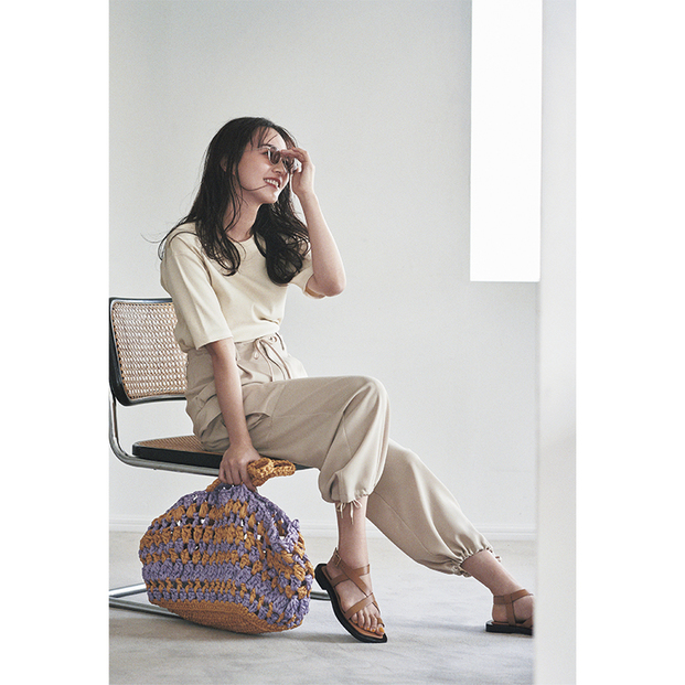 パンツ¥16,500(ザ ポーズ/ウィム ガゼット 玉川髙島屋S・C店)Tシャツ¥9,900(ブラックバイマウジー/バロックジャパンリミテッド)バッグ¥55,000〈MARIA LA ROSA〉サンダル¥27,280〈エー エメリー〉(ともにメゾン イエナ)サングラス¥30,800(ブラン)