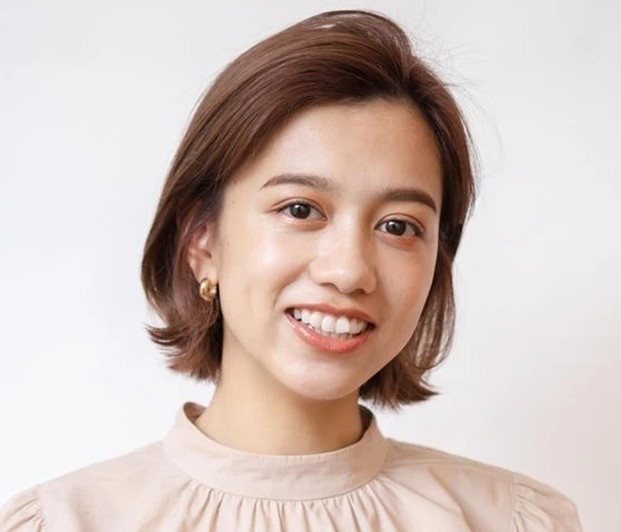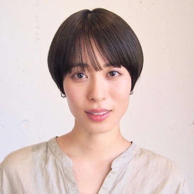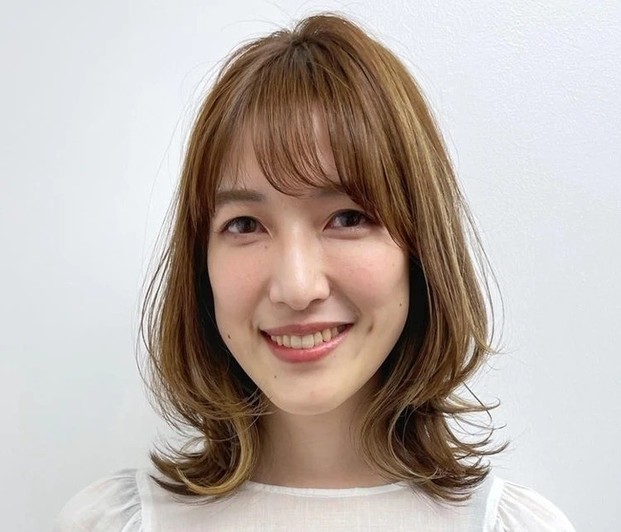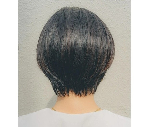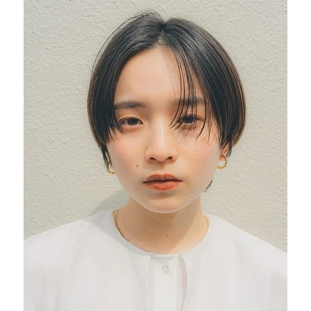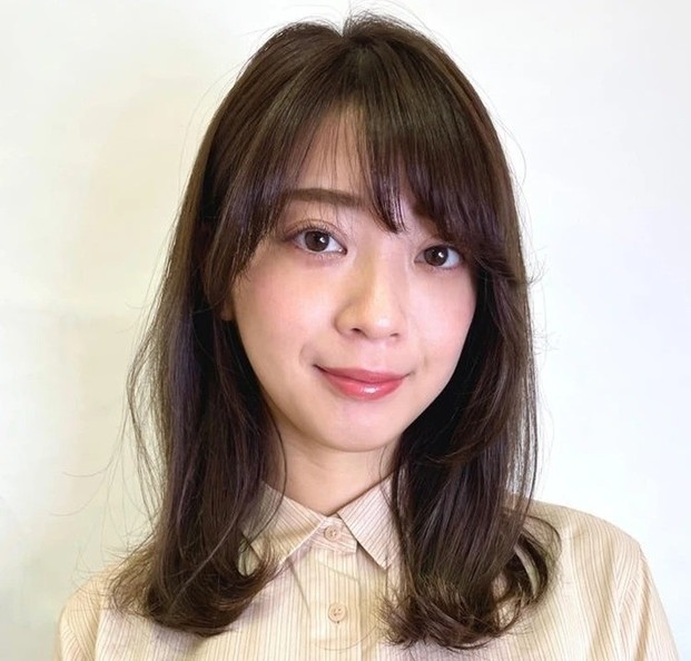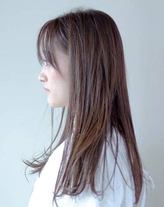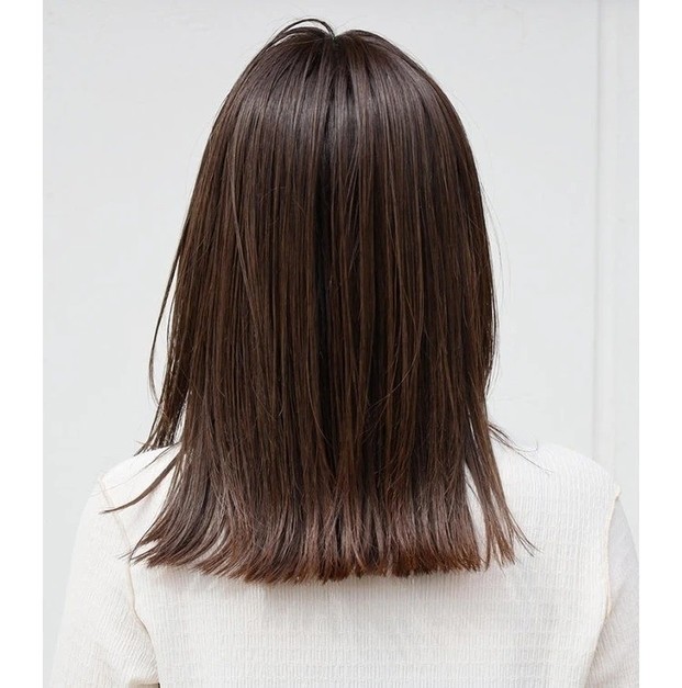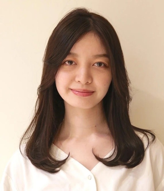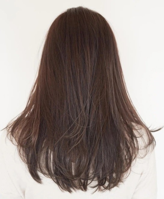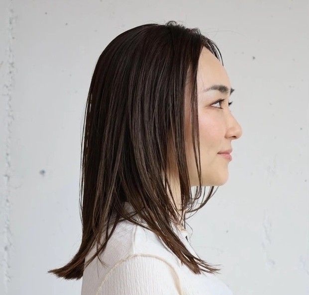 重たく、暗く見えがちな黒髪ロングは、ツヤをまとうことで凜とした知的さが漂う。根元のふんわりとしたボリュームを損なわないよう、ストレートパーマは根元・中間・毛先と箇所によって薬剤を分け、ナチュラルな毛流れを引き出して。カットは、毛先に厚みを残して、前上がりのレイヤースタイルに。顔まわりは軽やかさを出すため、前髪からサイドへかけてレイヤーをオン。輪郭を引き締めつつ、表情を明るく彩ってくれる。
