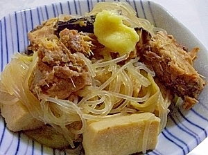 楽天レシピ:「ルクエで簡単♪サバ味噌煮缶と春雨のさっと煮 」より