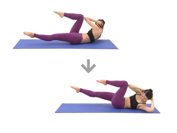 2. 両手で頭を支えながら上半身を持ち上げて、対角の肘と膝をつけるように動かしましょう。