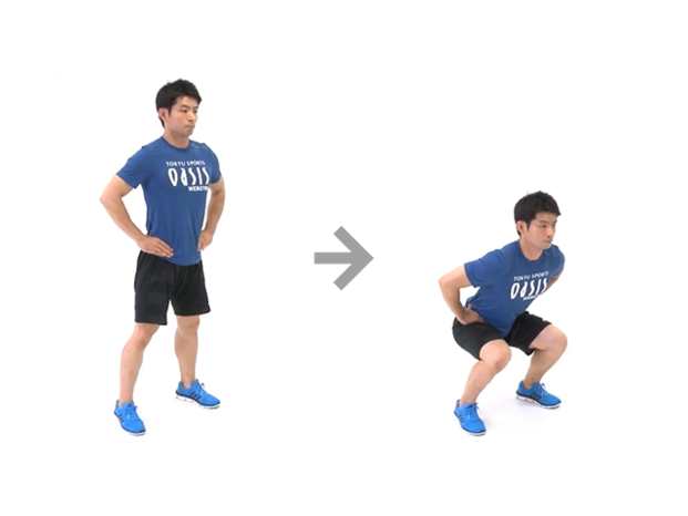 お尻を後ろに突き出して、股関節から曲げる意識を持ちましょう。また、膝がつま先よりも前に出ないよう注意できるといいですね。