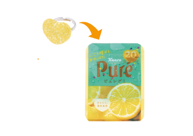「ピュレグミ」ブランドのグミ粒を指につけられるリング「Ringcolle! ピュレグミ リングコレクション」です。ピュレグミの特徴であるハート型やカラフルなカラー、「すっぱいパウダー」まで忠実に再現しています。リングはサイズ調整ができる仕様です。