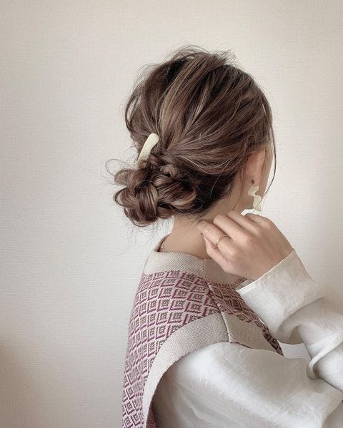 髪を2つに分けたら三つ編みにし、それぞれの毛束の編み目に通してまとめるだけの簡単な髪型です。