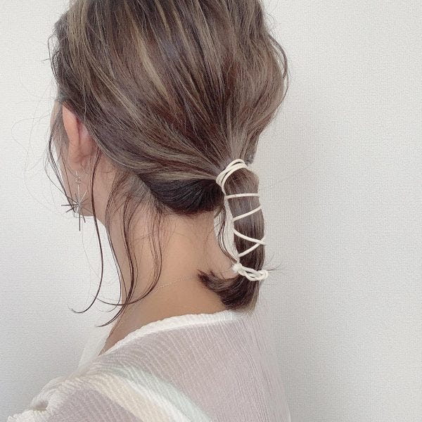 もう少し高い位置に作れば帽子に通すこともできるので、自分の好きな位置に髪をまとめたら自分好みの紐を巻きつけ、大人女性にも似合うおしゃれにアレンジしてあげるのがおすすめです。