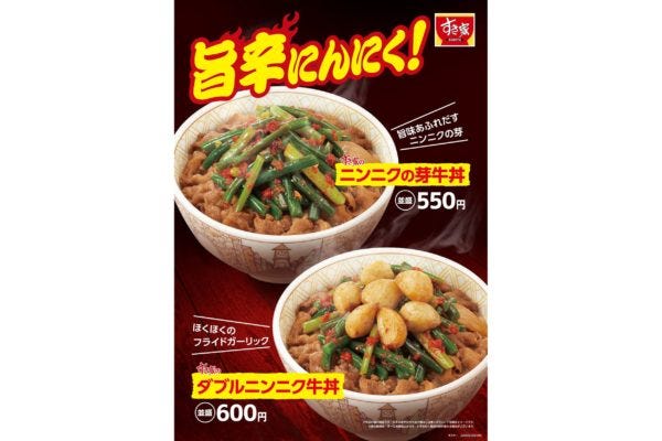 22日から、牛丼チェーン店「すき家」で夏の定番商品『ニンニクの芽牛丼』(並盛/ 550円 )、『ダブルニンニク牛丼』(並盛/600円 )が発売される。