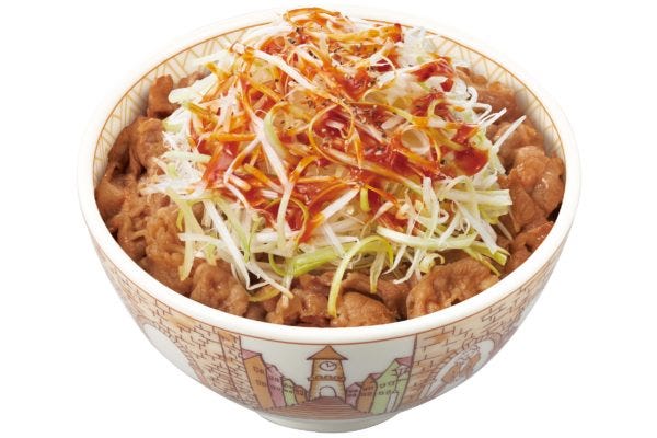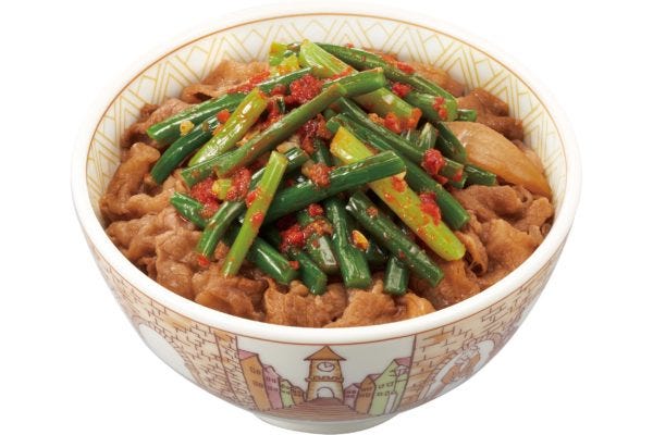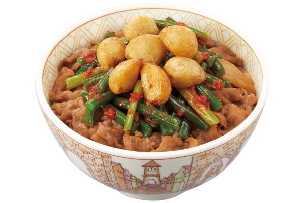 シャキシャキ食感のニンニクの芽をラー油と唐辛子をベースとした刻みニンニクたっぷりの“すき家特製旨辛だれ”で和え、牛丼にトッピングした逸品。