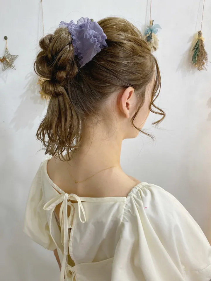 お団子・ロープ編み・ポニーテールなど簡単なヘアアレンジを組み合わせて、ミディアムヘアでもボリューム感を出したスタイルです。