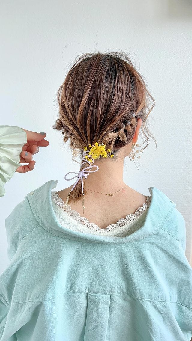 浴衣や着物の色に合わせたお花や紐を選ぶと、人気の紐アレンジをさらにおしゃれなヘアアレンジに変身させることができます。
