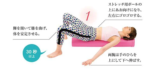 ・ストレッチ用ポールの上にあお向けになり、左右にゴロゴロする。