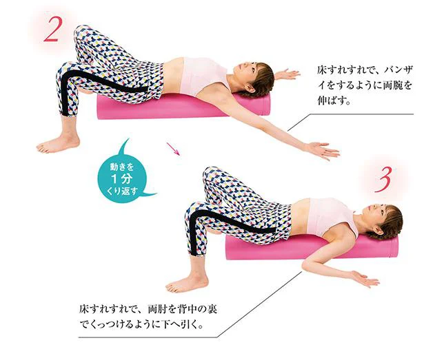 また、背中を丸めた「猫背」は前ももに負担をかける原因になります。猫背の改善には、胸の筋肉をゆるめることが有効。2分だけでいいので、ストレッチ用ポールに乗ることを、毎日の習慣にしてみましょう。