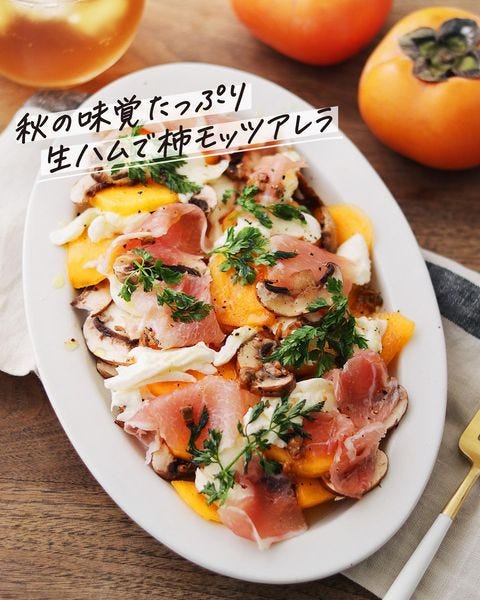 こちらは旬の柿を使ったおしゃれなサラダの、生ハムとマッシュルームの柿モッツァレラのレシピです。
