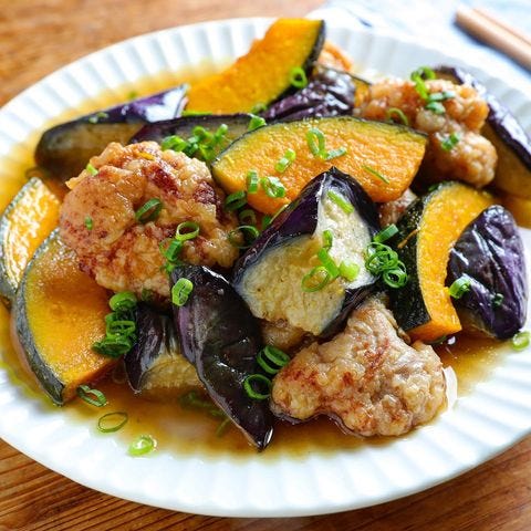 なすとかぼちゃ、衣をつけた鶏肉を揚げてから、かつおと昆布ベースの出汁に浸していただく、肉と野菜を一緒に食べられる嬉しいメニューです。