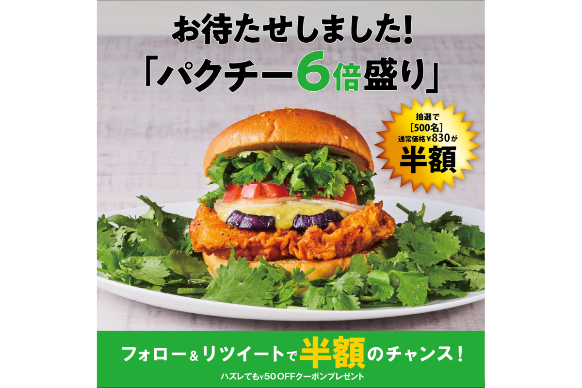 今回登場する『パクチーグリーンカレーチキンバーガーパクチー6倍』は、全国のパクチーを愛する「パクチニスト」からの熱いリクエストにより、現在販売中の『パクチーグリーンカレーチキンバーガー』のパクチーをさらに増量した攻めの商品。