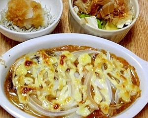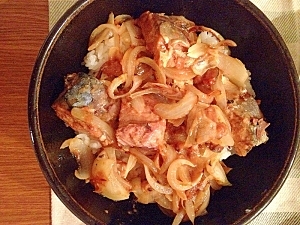 楽天レシピ:「さばの味噌煮缶と玉ねぎ丼 」より