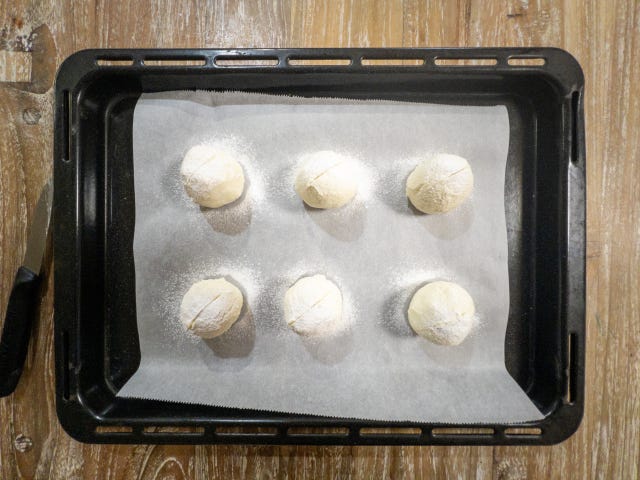 ③ ②を6等分にして丸め、天板の上に間隔を開けて乗せ、茶漉しなどを使って強力粉を振り、切り込みを1本入れて、予熱が完了したオーブンで15〜18分焼成します。