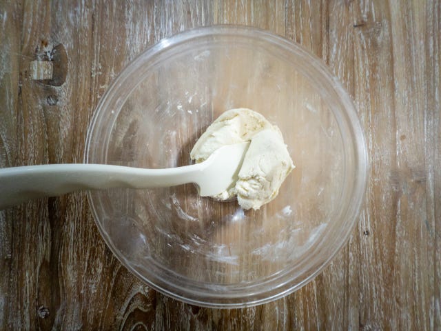 ② ホイッパーからゴムベラに持ち替え、①に米粉・ベーキングパウダーを加えて混ぜ合わせ、ひとまとめにします。