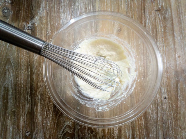 ① ボウルに絹ごし豆腐を入れてホイッパーで滑らかになるまで攪拌し、オリーブオイル・はちみつ・塩を加えて、さらに滑らかに攪拌します。