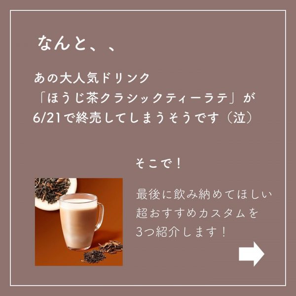 あの大人気ドリンク「ほうじ茶クラシックティーラテ」が、6/21で終売してしまうそうです。