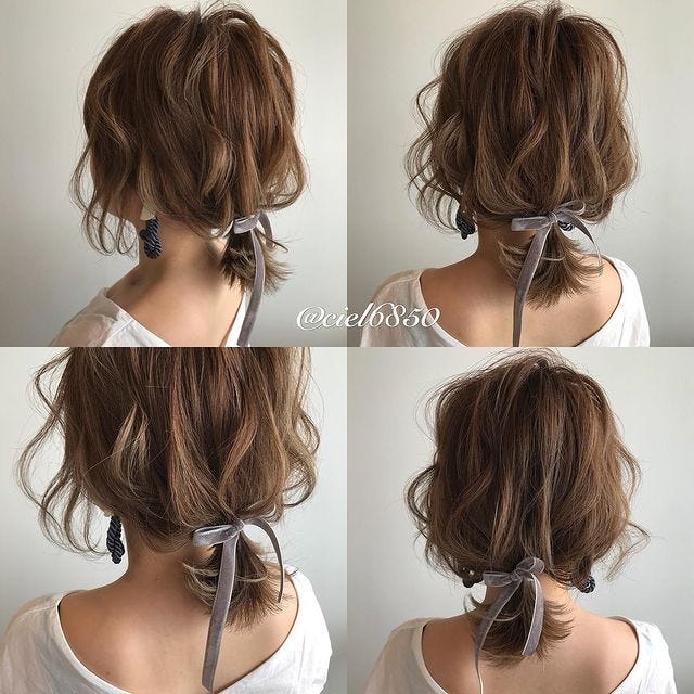 長めボブの髪型には、一つにまとめてリボンをつけるナチュラルなヘアアレンジもおすすめです。