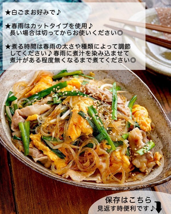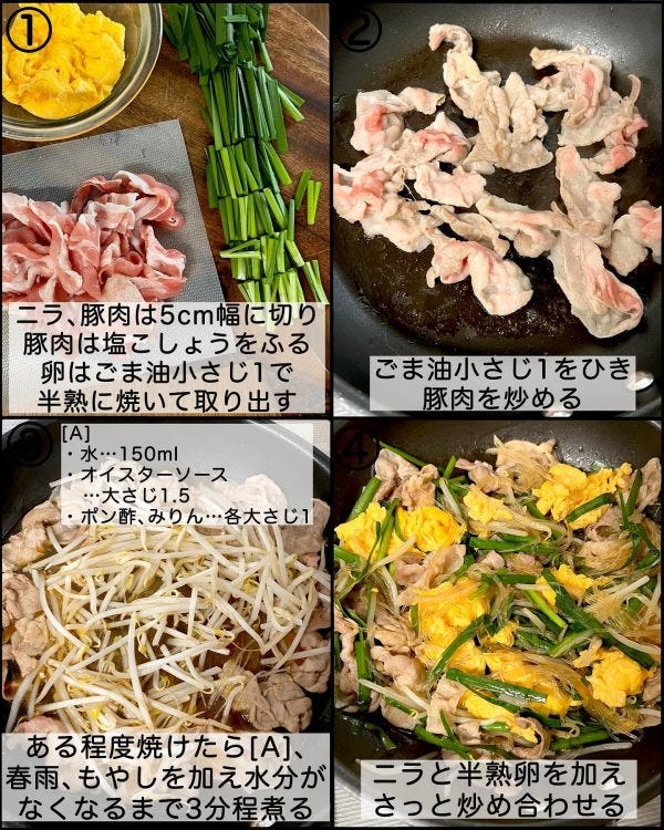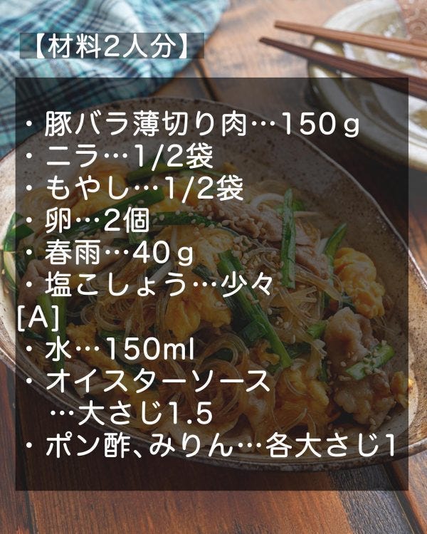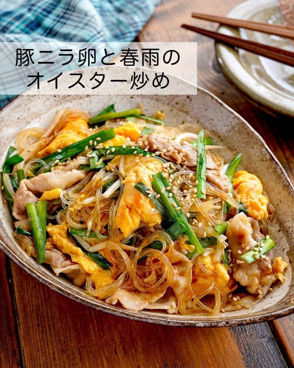 今回は「豚ニラ卵と春雨のオイスター炒め」をご紹介します。