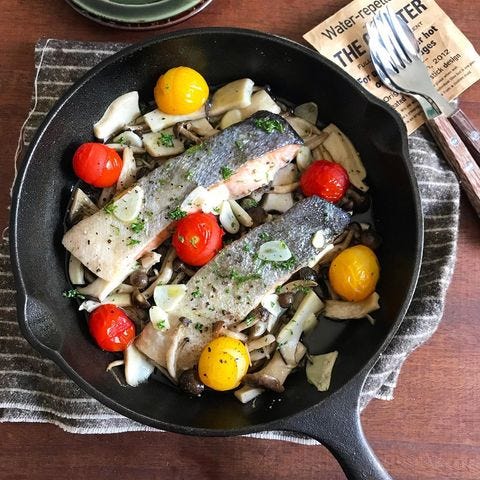 スーパーで1年中手に入る鮭を使ったアクアパッツァは夏のキャンプに、おすすめの魚料理です。