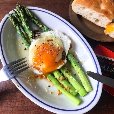 とろたまペペロンアスパラは、オリーブオイルやにんにくで炒めたアスパラガスに目玉焼きを乗っけるだけの簡単おつまみレシピです。