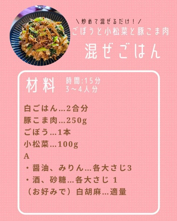 今回は「ごぼうと小松菜と豚こま肉混ぜごはん」をご紹介します。
