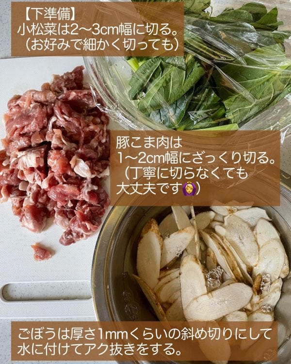 ごぼうと小松菜と豚こま肉混ぜごはんの材料