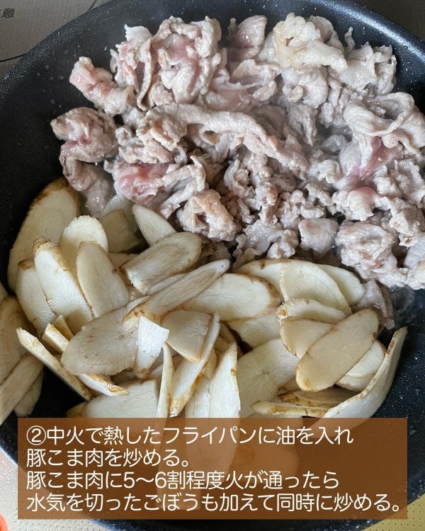 作り方②豚こま肉とごぼうを炒める