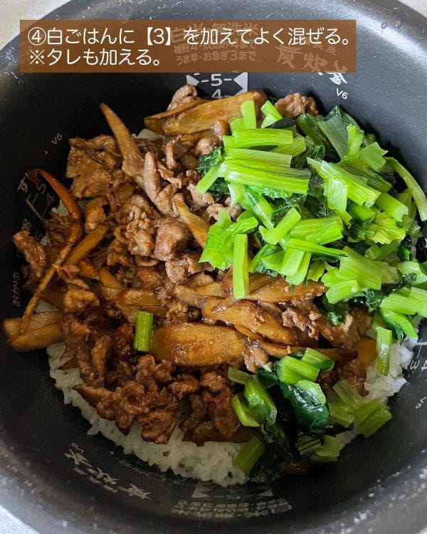 白ごはんに③を加えてよく混ぜる。※タレも加える。