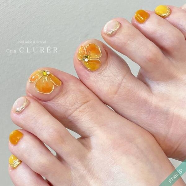 大ぶりのお花はリゾート感満載でこれからのシーズンに活躍すること間違いなしです。お花の周りをゴールドで囲むことによって、より立体感がましてリアルな印象に。シロップのようにみずみずしいオレンジのおかげで清潔感溢れるフットネイルに。
