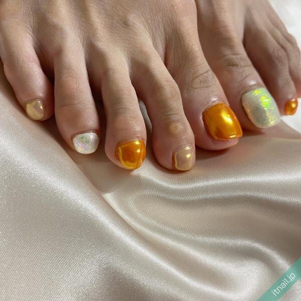 目立ったアートはないけれど、色と輝きで遊んだデザイン。パール感たっぷりのオレンジや大きめホログラムでプレイフルな仕上がりに。ストーンを使っていないので、スニーカーや先の細いパンプスの時でも痛くなりにくい。