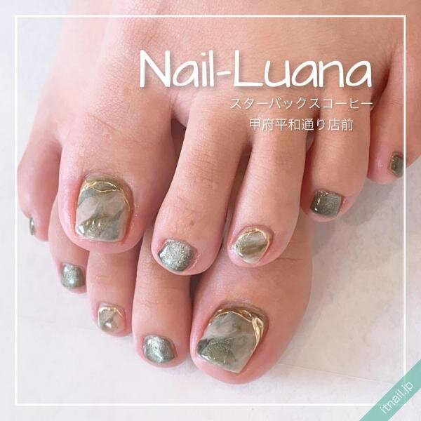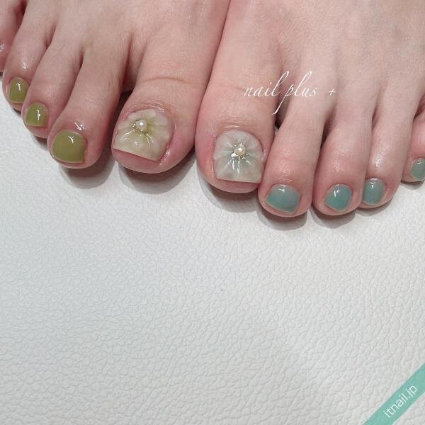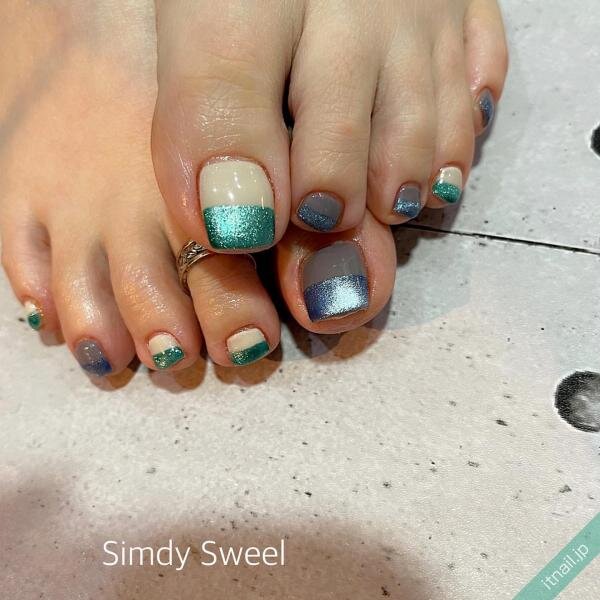輝くラメがシンプルなデザインをゴージャスにしてくれるこちらのデザイン。グリーンの爽やかな魅力に繊細なラメがよく映えます。シャンパンの様な涼やかな輝きが華やかな足元にしてくれます。