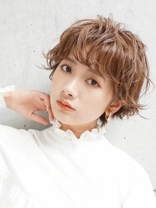 パーマでたっぷり動きをつけたショートは短めでも柔らかい印象を与えて女性らしい雰囲気を演出します。