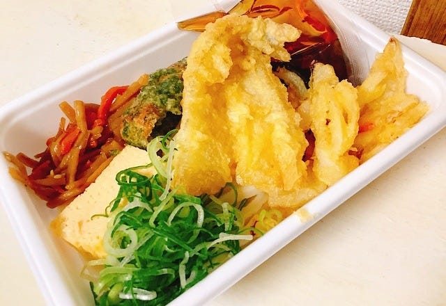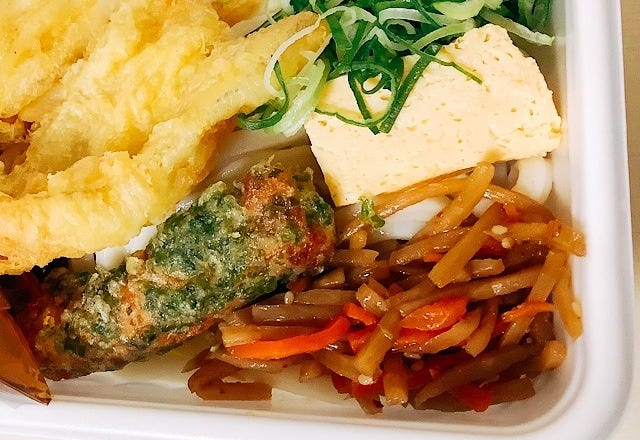 ぶっかけの場合は、冷たいうどんの上に天ぷらやおかずが乗っていて、パックになった別添えのダシをかけていただきます。