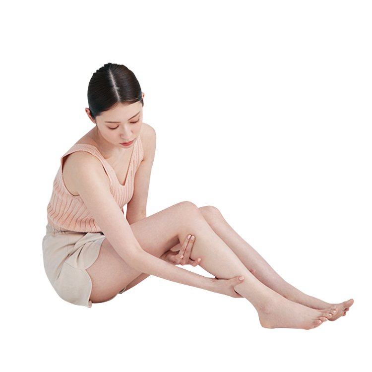 ふくらはぎ側面の骨のきわに沿って、足首からひざにかけて指圧。さらにリンパが集まるひざ裏もプッシュし、しっかりほぐすと巡りがよくなります。太ももは、手をグーにしてゴリゴリ。