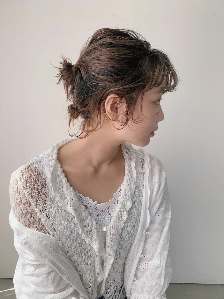 家事の途中や仕事中に落ちてくる襟足の髪が気になるというボブの大人女性には、こちらのように上下に分けて小さなお団子を作るアップヘアがおすすめです。