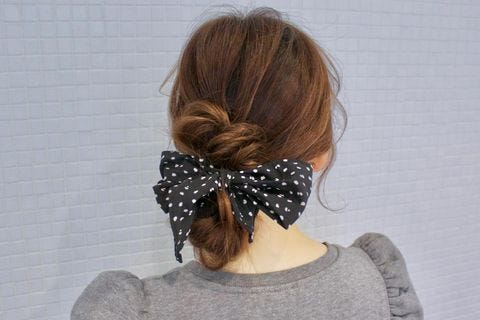 縦長なお団子にスカーフを巻き付けたような、おしゃれなこちらのアップヘアは巻き髪なしでゴムだけを使った簡単な髪型です。