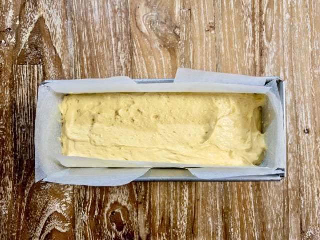 ⑤ クッキングシートを敷いたパウンド型に④を流し入れて表面を均し、高い場所から2〜3回落として空気を抜き、予熱が完了したオーブンで、25〜30分焼成します。