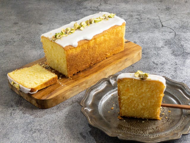 ⑥ 焼き上がったらケーキクーラーの乗せて冷まし、粉砂糖とレモン汁小さじ2杯を混ぜ合わせたグラスアローをパウンド型の上からかけ、ピスタチオをトッピングして乾かし、固まったら食べやすい厚さにカットして、完成です。