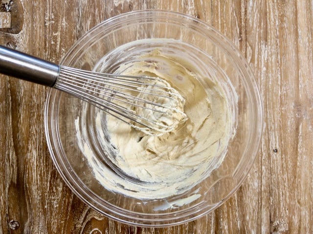 ② 乾いたボウルにバターを入れて、ホイッパーでマヨネーズ状になるまで混ぜ、砂糖を加えてさらに白っぽくなるまで混ぜ合わせます。