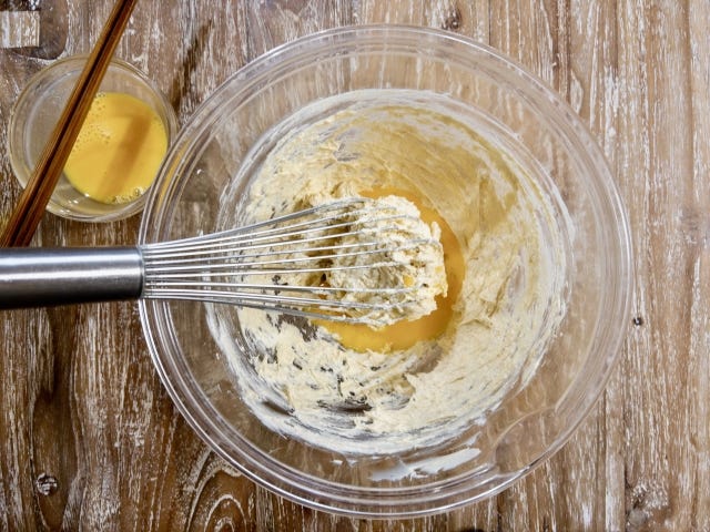 ③ 別のボウルに卵を割りほぐし、2〜3回に分けて②に加え、その都度よく混ぜ合わせ、①のレモンの皮のすりおろしとレモン汁大さじ2杯を加えて混ぜ合わせます。