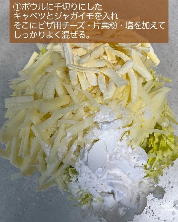 キャベツとジャガイモは千切りにして大きめボウルに入れ、そこにピザ用チーズ・片栗粉・塩を加えてしっかりよく混ぜる。