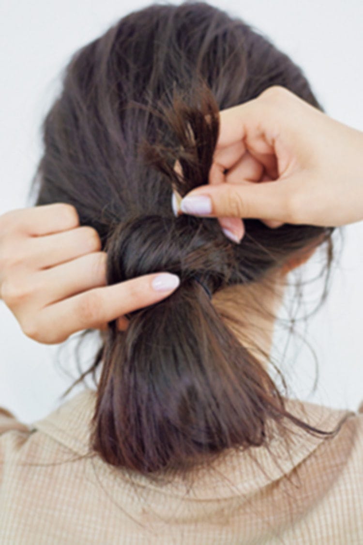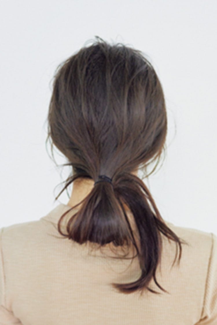 えり足で髪をまとめる。ゴムで結ぶときに毛束を完全に引き抜かず、わっか状にする。